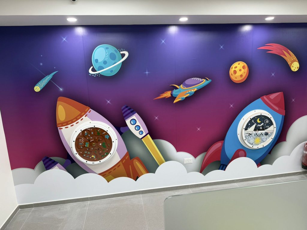 הקיר הכי מעניין בחדר הוא מוקד משיכה צבעוני וחווייתי, שנועד להצית את הדמיון ולמשוך את תשומת הלב של כל ילד שנכנס למתחם. הקיר מעוצב כעולם קסום – משולבים בו ציורי קיר גדולים ותלת־ממדיים, דמויות אהובות, אלמנטים אינטראקטיביים שניתן לגעת ולהזיז, ותאורה נסתרת שמדגישה פרטים ומעניקה תחושת עומק וחיים.