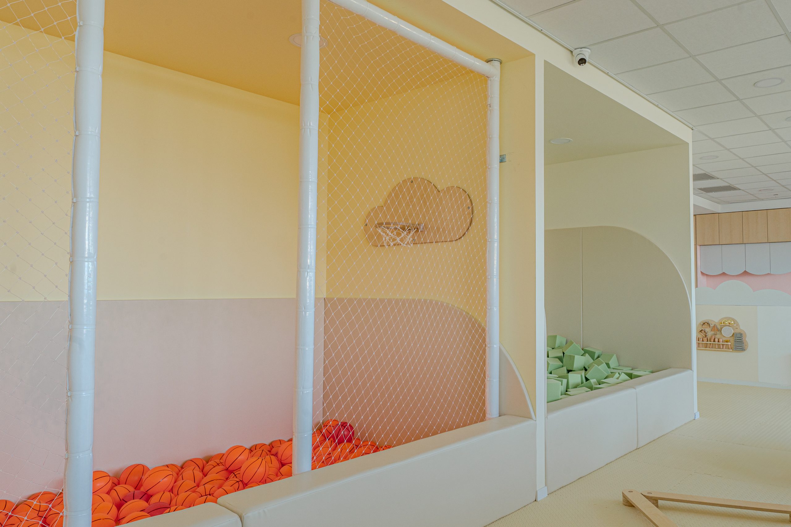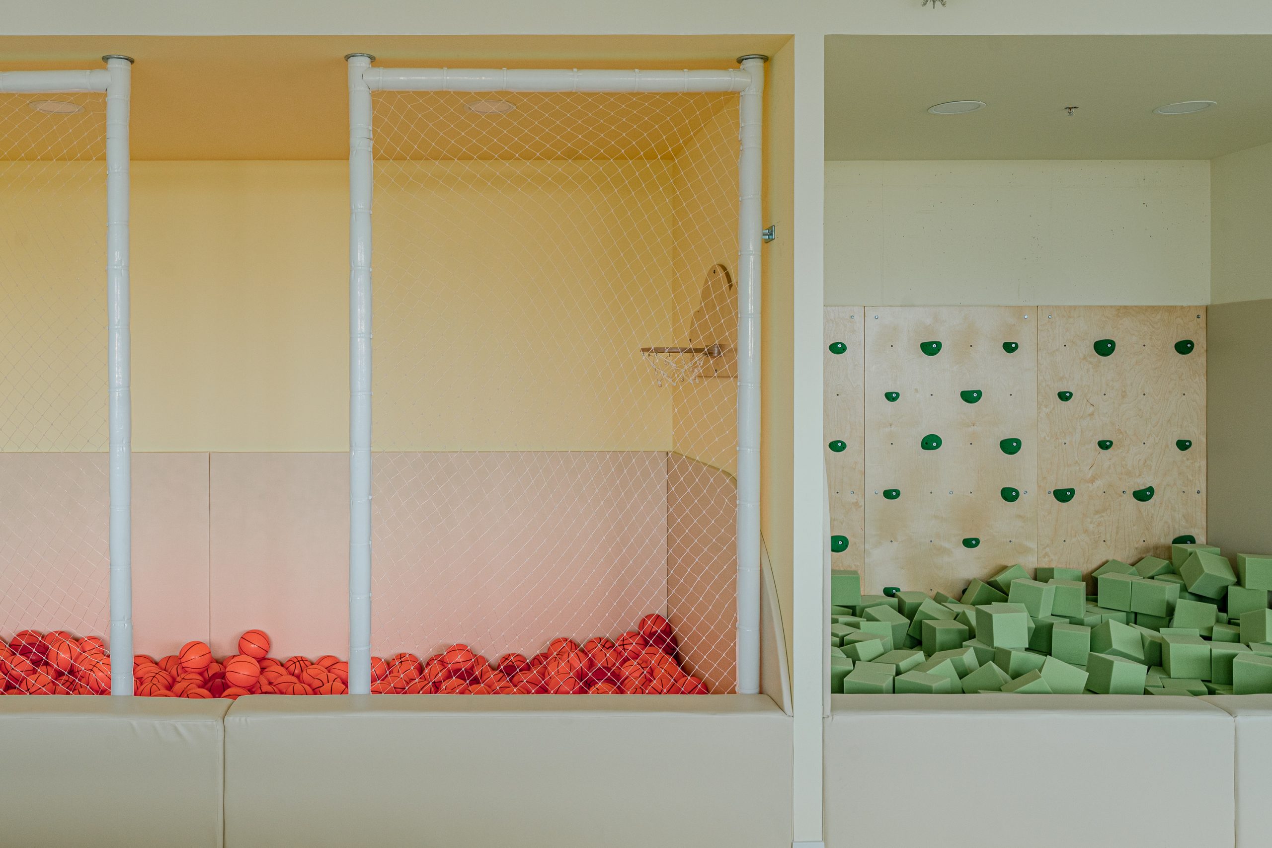 בריכת ספוגים עם קיר טיפוס ומתחם כדורסל