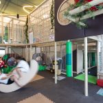 משחקייה דו קומתית הכוללת מתקן רב מרחב עם אלמנט טיפוס במרכז החלל